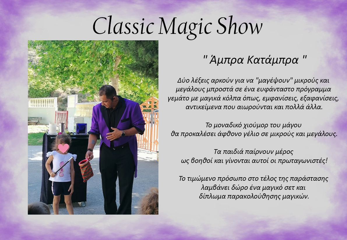 Δύο λέξεις αρκούν για να "μαγέψουν" μικρούς και μεγάλους μπροστά σε ένα ευφάνταστο πρόγραμμα γεμάτο με μαγικά κόλπα όπως εμφανίσεις, εξαφανίσεις, αντικείμενα που αιωρούνται και πολλά άλλα.