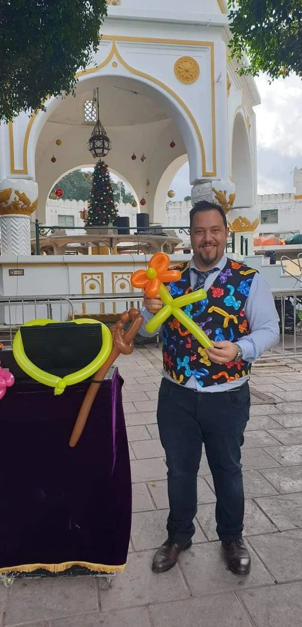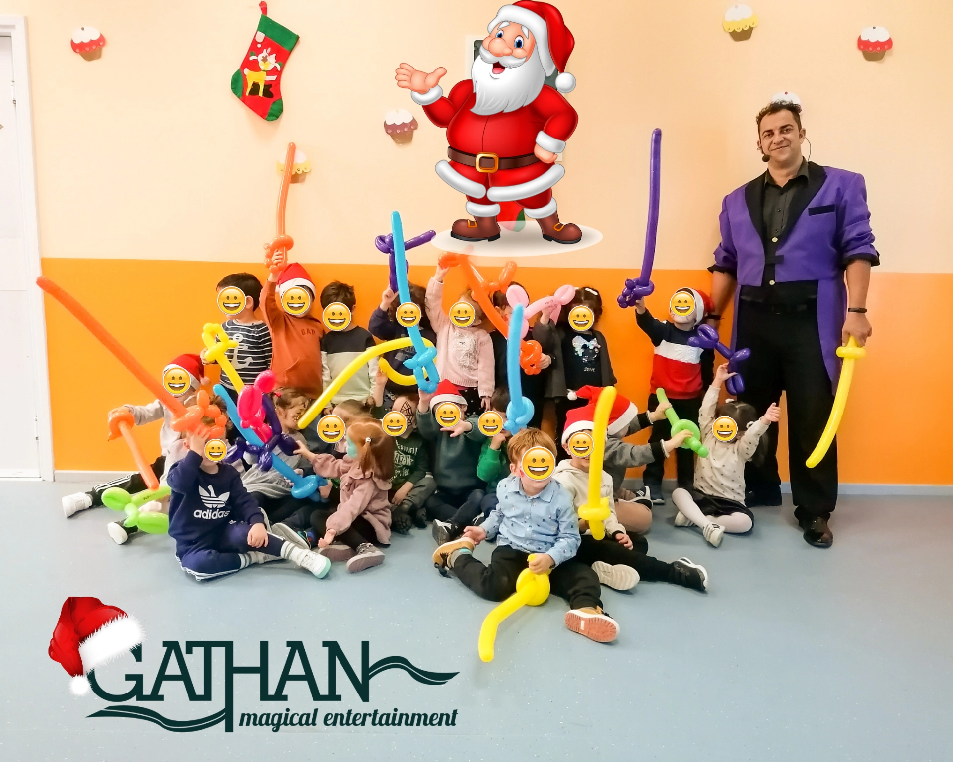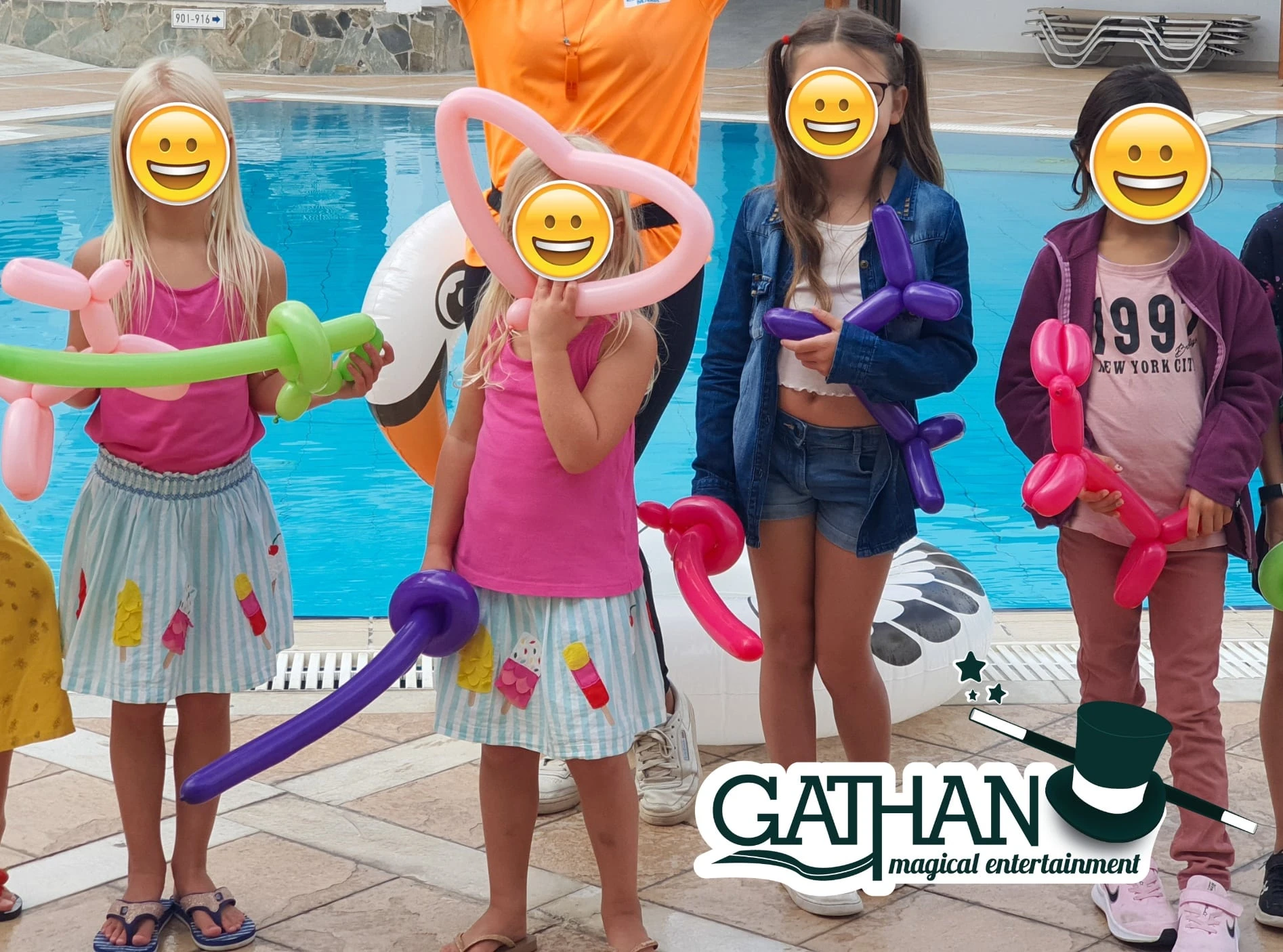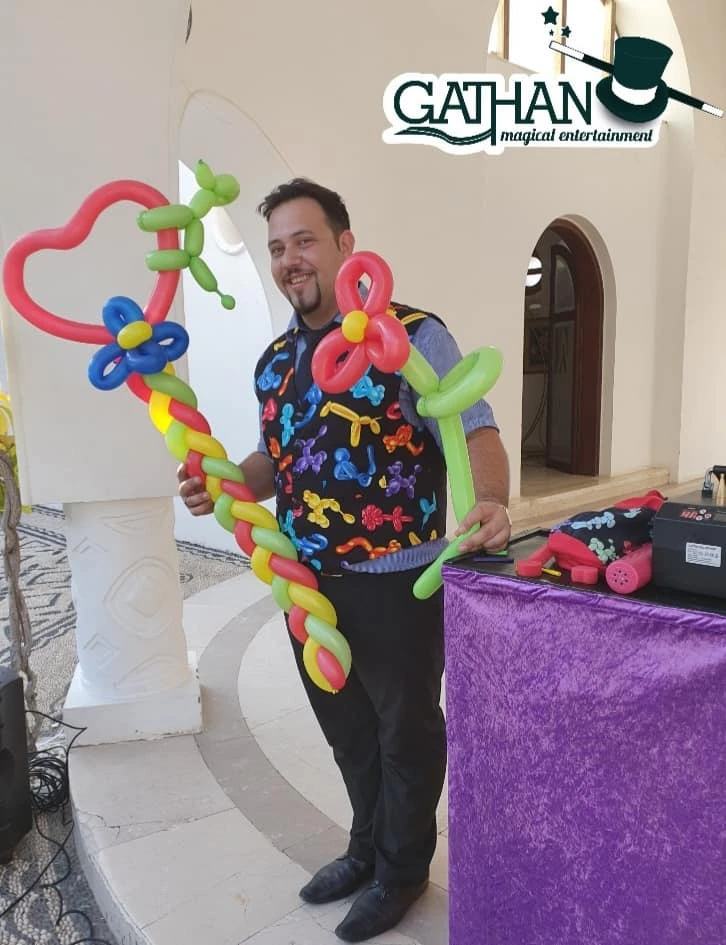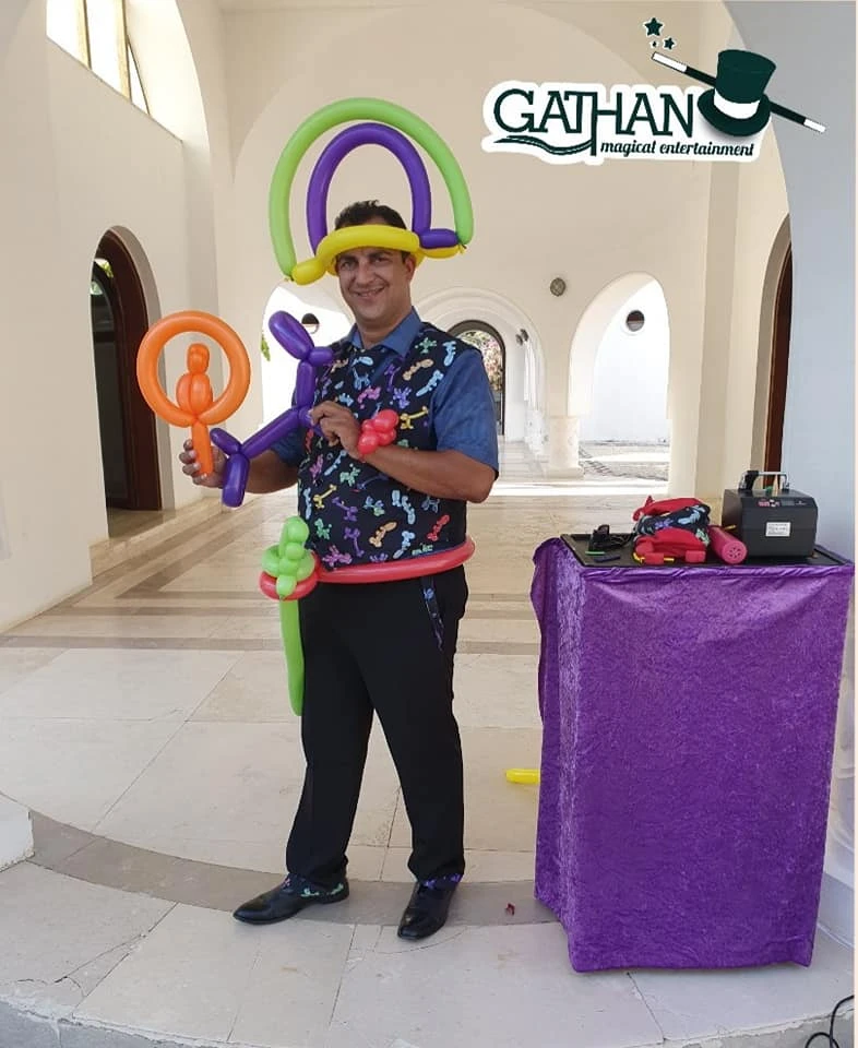 Ο εμψυχωτής έρχεται στο χώρο σας με ένα ωραίο γιλέκο και ένα μεγάλο καπέλο από μπαλόνια. Η παράσταση ξεκινάει με τον εμψυχωτή να κάνει εντυπωσιακά μαγικά κόλπα μόνο με μπαλόνια.
